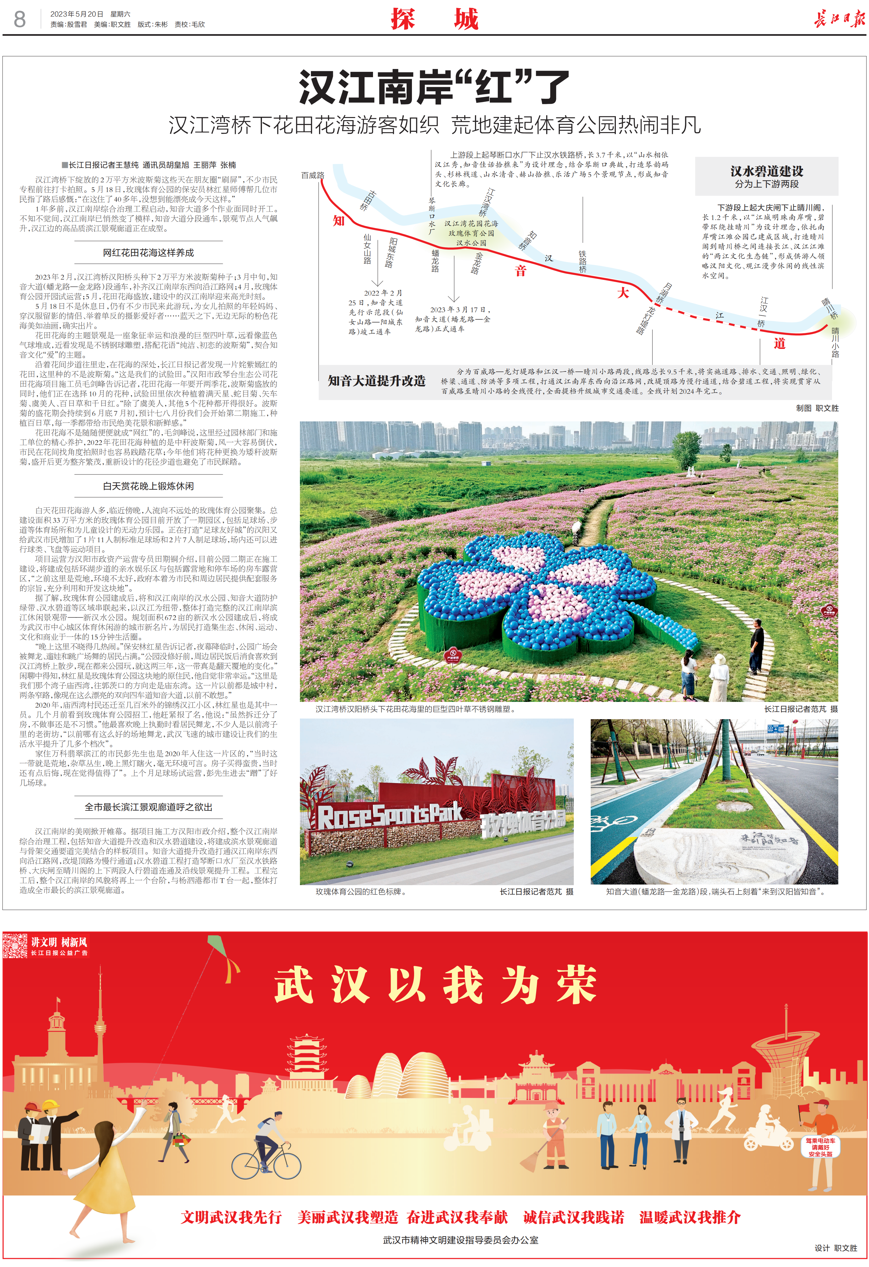 長江日報推出《漢江南岸“紅”了漢江灣橋下花田花海游客如織 荒地建起體育公園熱鬧非凡》專版報道。